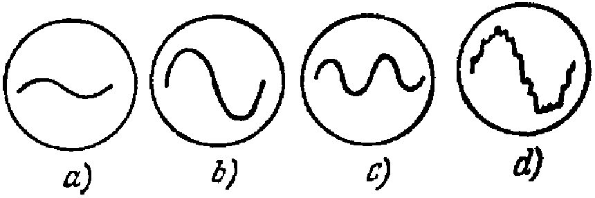 Если звуковая волна попадает в микрофон, то возникает небольшое переменное напряжение. Это напряжение изменяется точно с такой же частотой и амплитудой, что и звуковая волна. Изменяющееся напряжение подается по проводам на осциллограф, на экране которого можно видеть изображения, подобные тем, которые приведены на рис.17.