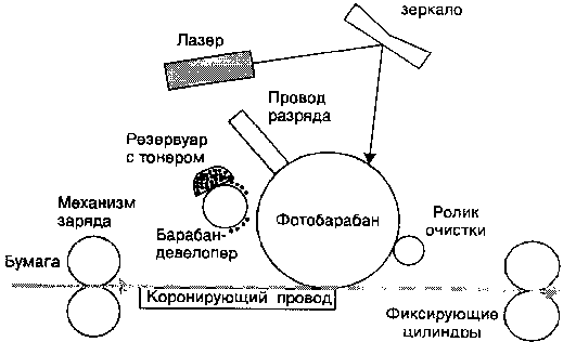 Важнейшим конструктивным элементом лазерного принтера является вращающийся фотобарабан, с помощью которого производится перенос изображения на бумагу. Фотобарабан представляет собой металлический цилиндр, покрытый тонкой пленкой из фотопроводящего полупроводника (обычно оксид цинка). По поверхности барабана равномерно распределяется статический заряд. С помощью тонкой проволоки или сетки, называемой коронирующим проводом. На этот провод подается высокое напряжение, вызывающее возникновение вокруг него светящейся ионизированной области, называемой короной.