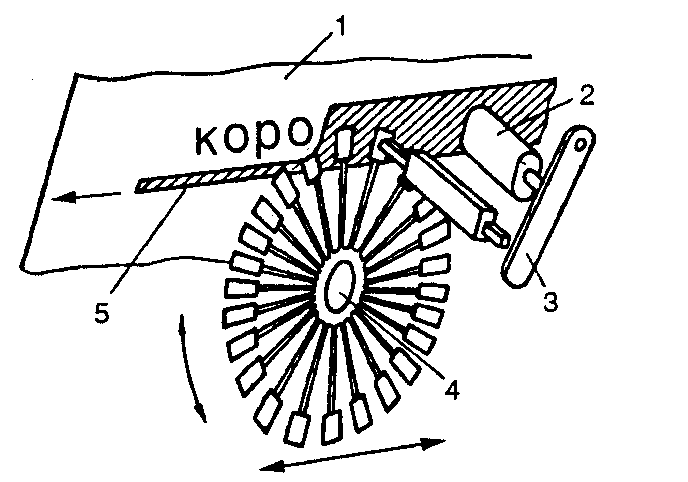 Принцип работы принтера типа "ромашка": 1 — бумага; 2 — электромагнит; 3 — молоточек;