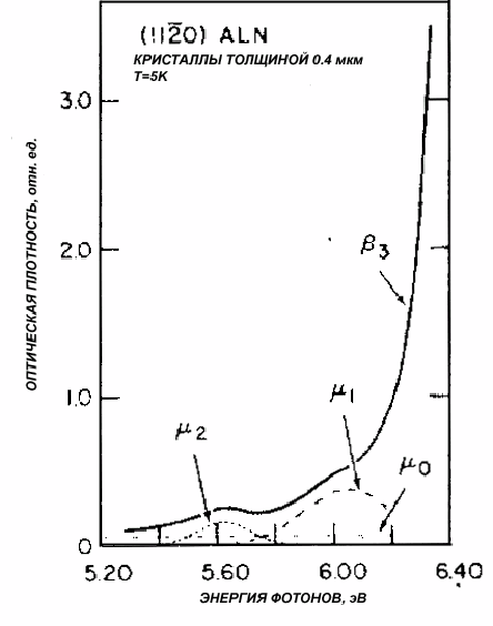 Рисунок 1.1.1. Зависимость оптической плотности от энергии фотонов для образца AlN толщиной 0.4 мкм при 5 К [2]