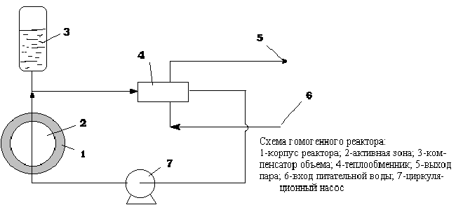 Ядерная реакция деления происходит в топливном растворе, находящемся внутри сферического корпуса реактора, в результате температура раствора повышается. Горючий раствор из реактора поступает в теплообменник, где отдает теплоту воде второго контура, охлаждается и циркулярным насосом направляется опять в реактор. Для того чтобы ядерная реакция не произошла вне реактора, объемы трубопроводов контура, теплообменника и насоса подобраны так, чтобы объем горючего, находящегося на каждом участке контура, были намного ниже критического. Гомогенные реакторы имеют ряд преимуществ по сравнению с гетерогенными. Это несложная конструкция активной зоны и минимальные ее размеры, возможность в процессе работы без остановки реактора непрерывно удалять продукты деления и добавлять свежее ядерное топливо, простота приготовления горючего, а также то, что управлять реактором можно, изменяя концентрацию ядерного топлива.