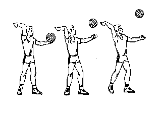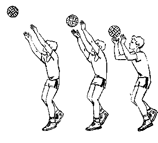 Передача сверху двумя руками. В исходном положений туловище игрока расположено вертикально, ноги на ширине плеч или одна нога несколько впереди. Степень сгибания ног зависит от высоты траектории полета мяча. Руки выносятся перед лицом, кисти рук оптимально напряжены. С приближением мяча игрок начинает встречное движение выпрямлением ног, туловища и рук. При выполнении ударного движения в момент соприкосновения с мячом пальцы рук сначала амортизируют встречный полет мяча, затем кисти и пальцы рук упруго и эластично выпрямляются, придавая мячу новое поступательное движение. Указательные и средние пальцы являются основной ударной частью, безымянные и мизинцы удерживают мяч в боковом направлении. Сообщение мячу нового направления с определенной траекторией требует увеличения мышечных усилий, что проявляется в согласованном движении ног, туловища и рук (рис. 6). При передаче назад игрок поднимает руки, располагая их тыльной стороной кистей над головой, разгибает ноги, отклоняет туловище вверх-назад. Передача выполняется за счет разгибания рук в локтевых суставах и движения туловища назад-вверх, с одновременным прогибанием в грудной и поясничной частях позвоночного столба.