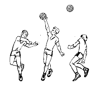Блокирование. Определив направление и высоту передачи мяча для нападающего удара, игрок передвигается к предполагаемому месту встречи с мячом приставными шагами, скачком или медленным бегом. При этом ноги его незначительно согнуты в коленных, а руки - в локтевых суставах, кисти находятся на уровне головы. Перед блокированием игрок сильнее сгибает ноги в коленных и голеностопных суставах, ноги на ширине плеч, а предплечья согнутых рук, поднимаются несколько выше головы. При блокировании нападающих ударов, выполняемых после обычных передач, игрок отталкивается от опоры в тот момент, когда нападающий находится в безопорном положений. Определив действия нападающего, блокирующий отталкивается от опоры, при этом движение начинается руками, а затем ногами. Резким разгибанием ног, выпрямлением туловища и энергичным махом руками игрок принимает вертикальное положение.
