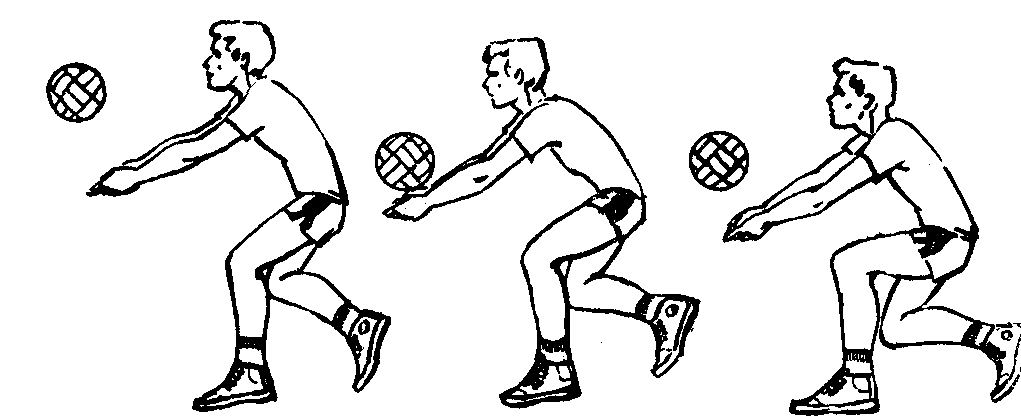 Прием мяча снизу двумя руками. Мячи, летящие на уровне пояса (или ниже пояса), принимаются, как правило, снизу двумя руками. При этом кисти рук соединены вместе и вынесены вперед. При приближении мяча игрок разгибает ноги, туловище поднимает несколько вверх и вперед. Удар по мячу выполняют предплечьями, затем руки смещают вперед вверх за счет выпрямления туловища и разгибания ног (рис. 9).