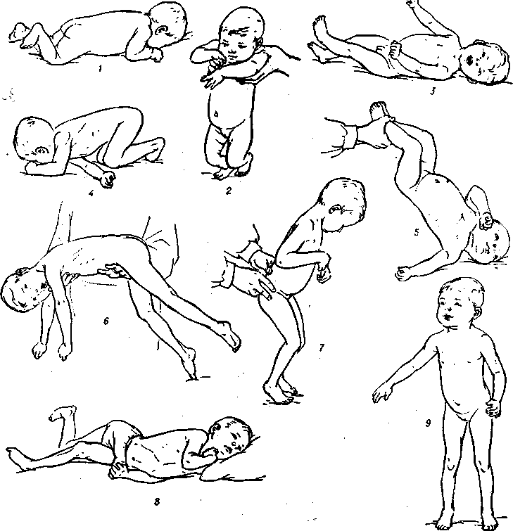 Рис. 1. Некоторые виды патологических рефлексов ври детских церебральных параличах: 1- отсутствие защитного рефлекса (нет поворота головы в сторону, который бывает у здорового новорожденного в положении ничком); 2 - угнетение рефлекса опоры (нет рефлекторного выпрямления ног); 3 -5—лабиринтный тонический рефлекс (3 - при положении на спине - напряжение мышц разгибателей шеи, туловища и конечностей, 4 – при положении на животе - напряжение мышц сгибателей туловища и конечностей, отсутствует физиологический лордоз, 5 - в сочетании с шейным асимметричным тоническим рефлексом - при подъеме за ноги из положения на спине появляются напряжение разгибателей шеи и спины, разгибание руки, к которой обращено лицо, и сгибание другой руки); 6 - отрицательный симптом Ландау (симптом «свешенного белья» - ребенок, поддерживаемый в положении на животе, не поднимает головы, не разгибает туловища); 7 - спастическая диплегия (синдром Литтла - нарушение опорной функции ног); 8 - двойная гениплегия (паралич всех конечностей, контрактуры); 9 - атонически-астатическая форма (туловищная атаксия — ребенок стоке на широко расставленных ногах, балансируя с помощью рук для удержания равновесия).