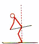 Хорошее положение тела "освобождает скорость". Запомните это и сравните заключительные два кадра (5,6) на рисунках 2-А и 2-Б. Они показывают заключительные моменты толчка, когда вес переносится на переднюю скользящую ногу (штриховая линия переходит с одной пятки на другую). Посмотрите в обеих моделях, где находится центр тяжести тела (круг) относительно штриховой вертикальной линии, показывающей положение пятки скользящей ноги. Они не очень сильно отличаются на кадре 5, особенно если не смотреть на рисунок тела, а смотреть только на круг и штриховую линию. Но как только произошел толчок, и штриховая линия перескочила на другую ногу, которая теперь стала скользящей, отличия становятся принципиальными и хорошо заметными (см. кадр б). В обоих примерах толчковая нога вытолкнула одинаковую массу тела. Но на рисунке 2-А центр тяжести тела все еще находится далеко позади скользящей ноги. Теперь ясно видно, кто из этих двух лыжников получил большее количество "свободной скорости". Положение тела лыжника на рисунке 2-Б значительно выгоднее для продвижения тела вперед.