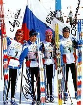 Российские лыжницы - победители в эстафете 4х10 км. на олимпиаде в Нагано: Л. Лазутина, Н. Гаврылюк, Е. Вяльбе, О. Данилова. |