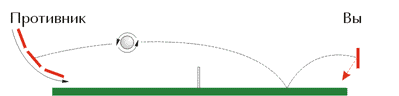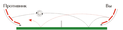 Если закрученный мяч после подрезки попадет на вертикально расположенную ракетку, то он отскочит вниз (рис. 3).