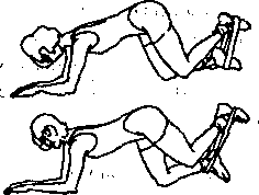 Варианты: Стоя, руки на поясе, отведение прямой ноги назад с сопротивлением. Стоя на локтях и коленях, равномерно распределив массу тела. Поднимите вверх согнутую в колене ногу, пока задняя линия бедра не встанет параллельно полу, подошва смотрит точно вверх. Нажимая на пятку, выпрямите поднятую вверх ногу, согните ногу в колене, вернитесь в исходное положение. То же другой ногой. |