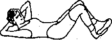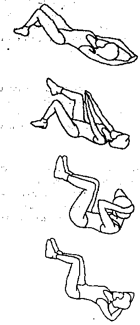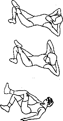 Лежа на спине, ноги согнуты. Согнутую правую ногу положите на колено левой ноги, руки за голову, локти разведены в стороны. Приподняться и наклониться правым локтем к левому колену. Лежа на спине, левую ногу перекинуть через правую, левую руку в сторону, правой рукой сильно нажать на левое бедро и держать несколько секунд. |