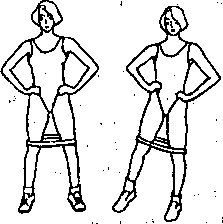Разработка боковых мышц бедер Стоя, ноги врозь, надев эластичное кольцо чуть выше коленей, слегка согните, их, руки на поясе. Выпрямите обе ноги, отведите правую ногу в сторону растягивая эластичное кольцо, медленно опустите ногу, вернитесь в исходное положение. |