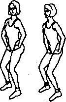 Разработка ягодичных мышц, задних мышц бедра Стоя, ноги врозь, руки на бедрах, живот втянут. Сгибая колени, движение выполнять вниз - назад до тех пор, пока бедра не встанут параллельно полу. Зафиксируйте положение, вернитесь в исходное положение. |