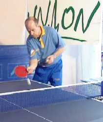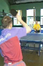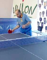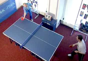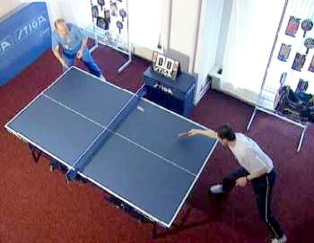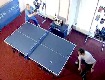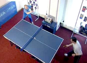 И Анатолий Амелин снова вынужден заходить для удара справа. Он даже поднимается на мысочки - отскок от стола получился высоким. Ну, а мне осталось лишь занять удобное положение и принять мяч опять слева. Не хочет сдаваться Анатолий Амелин, продолжает Сергей. Гоняет меня по всему столу.