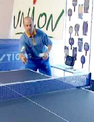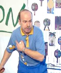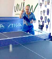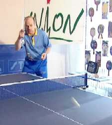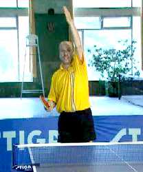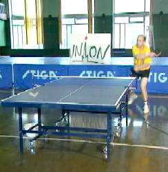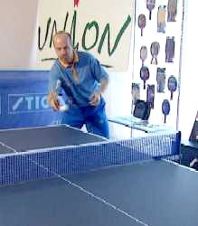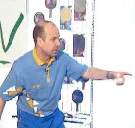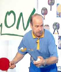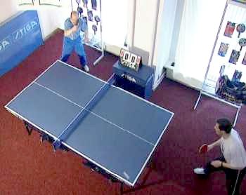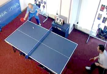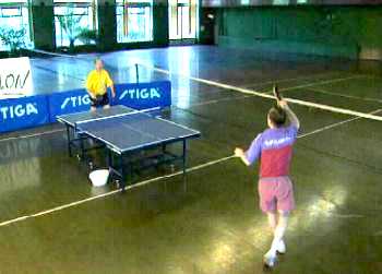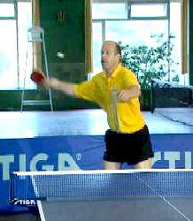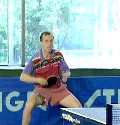 Именно в этот момент, когда противник находится почти в безопорном положении, Анатолий Амелин резко отводит руку назад и наносит быстрый топ-спин по диагонали (вы можете произвести и простой накат - в данном случае важна не сила вращения, а неожиданность нанесения удара).