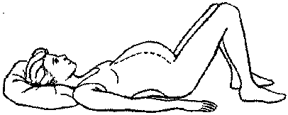 Предостережение позвоночника, установка стоп. С пятого месяца беременности не следует выполнять упражнений при плоском лежании, так как матка, достигшая уже значительных размеров, может оказать давление на кровеносные сосуды, нарушив кровообращение. Увеличенное выпрямление стоп может быть причиной судорог голени, несмотря на срок беременности. Стопы следует сгибать, направляя пальцы к лицу.