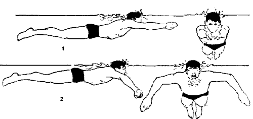 1- перед началом гребка руками тело пловца вытянуто, руки несколько развернуты ладонями к наружи;