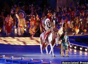 После того, как спортсмены разместились на специально отведенных местах, продолжилось представление. На стадионе появились представители пяти народностей штата Юта, символизирующие собой пять континентов, которые принимают участие в Олимпийских играх. Они появились на пяти гигантских барабанах, исполняя свои традиционные танцы. После этого перед зрителями прошли картины истории американского Запада - страны ковбоев и романтиков.