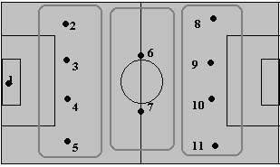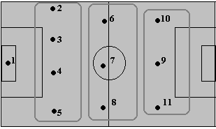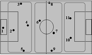Футбол, как и любая другая игра, не терпит бессистемности. Это поняли еще семьдесят лет назад, когда появилась первая игровая схема. До тех пор никакой системы не было, каждый игрок шел к чужим воротам, единственной целью его было забить мяч, а о защите собственных ворот должен был думать лишь вратарь. Условно ту тактику можно описать формулой 1+10 (см рис. 3), где 1 - это вратарь, а 10 -остальные полевые игроки. Естественно, что кроме хаоса на поле эта схема ни к чему хорошему не приводила, и вскоре появляется первая по-настоящему серьезная схема игры, названная “дубль-ве”, из-за внешнего сходства с начертанием латинской буквы W (см. рис.4). Два защитника, три хавбека и пять нападающих по-прежнему определяли стиль игры как атакующий. Эта схема применялась вплоть до 1958 года, когда на чемпионате мира в Швеции сборная Бразилии под руководством Висенте Феолы не внедрила новую “бразильскую” систему 4+2+4 (см. рис. 5). Два полузащитника оттянулись чуть назад, а один форвард, перешедший в середину поля, обеспечивал численный перевес как в атаке, так и в обороне, поскольку и там, и там у команды был теперь численный перевес.Не успели еще многие команды перейти на 4+2+4, как уже через четыре года, на чемпионате мира в Чили, та же сборная Бразилии, во главе с временно заменившим Феолу Айморе Моррейрой, применила новую схему- 4+3+3 (см. рис. 5). Один нападающий оттянулся в полузащиту, обеспечив ей еще большую мобильность и гибкость. Оборона бразильцев стала поистине непроходимой, а шестеро атакующих игроков сводили на нет все преимущества “старой” системы. Это позволило бразильцам стать двукратными чемпионами мира.