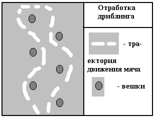 Дриблинг на скорости - Ведение мяча на высокой скорости с частой попеременной сменой ведущих ногДриблинг с препятствиями - проведение мяча между установленными согласно рис.8 отметками.