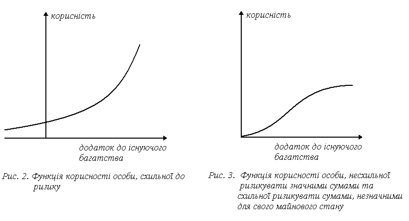 Хто з нас не купував лотереї спортлото, не бився об заклад на кухоль пива чи щось подібне. Імовірність отримати виграш у лотереї – мізерна, але процес цікавий: барабан обертається й, може, щастя повернеться до нас обличчям? Та й втрати не такі великі ... Коли ж друзі б’ються об заклад, то теж великі суми не в ходу. Тому досить правдоподібною гіпотезою виглядає припущення про схильність більшості людей до ризику, якщо суми (чи об’єкти), якими ризикують, невеликі порівняно зі статком людини. Важливо підкреслити, що йдеться саме про суми відносно того, що має людина. Для когось 1 000 гривень – це недосяжна мрія, а хтось і втрати 10 000 не помітить. Все відносно ...