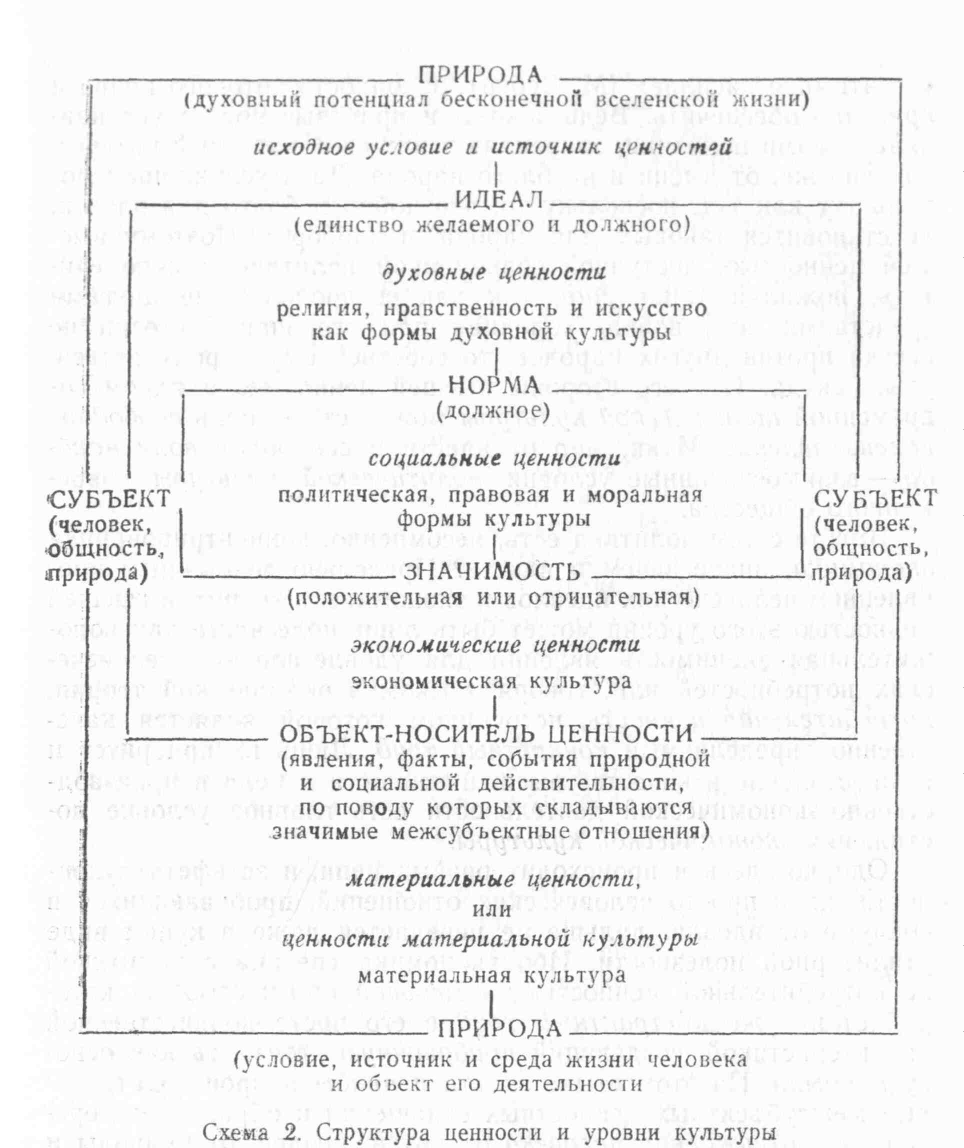 В структуре ценности, согласно Г.П.Выжлецову, - три взаимосвязанных основных элемента: значимость, норма, идеал. Культура и определяется степенью осуществления ценностей и реализации ценностных отношений во всех сферах человеческой деятельности. И ценности культуры могут функционировать как значимости, как нормы и как идеалы. Правда, значимость (полезность, пригодность) и норма (должное) характерны и для того, что я называю цивилизацией, и для низших уровней культуры, на которых культурность порой почти неотличима от цивилизации.