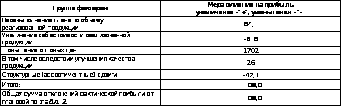 Заканчивается анализ меры влияния факторов на прибыль от реализации товарной продукции обобщением проведенных выше расчетов, для чего целесообразно использовать аналитическую таблицу 4.
