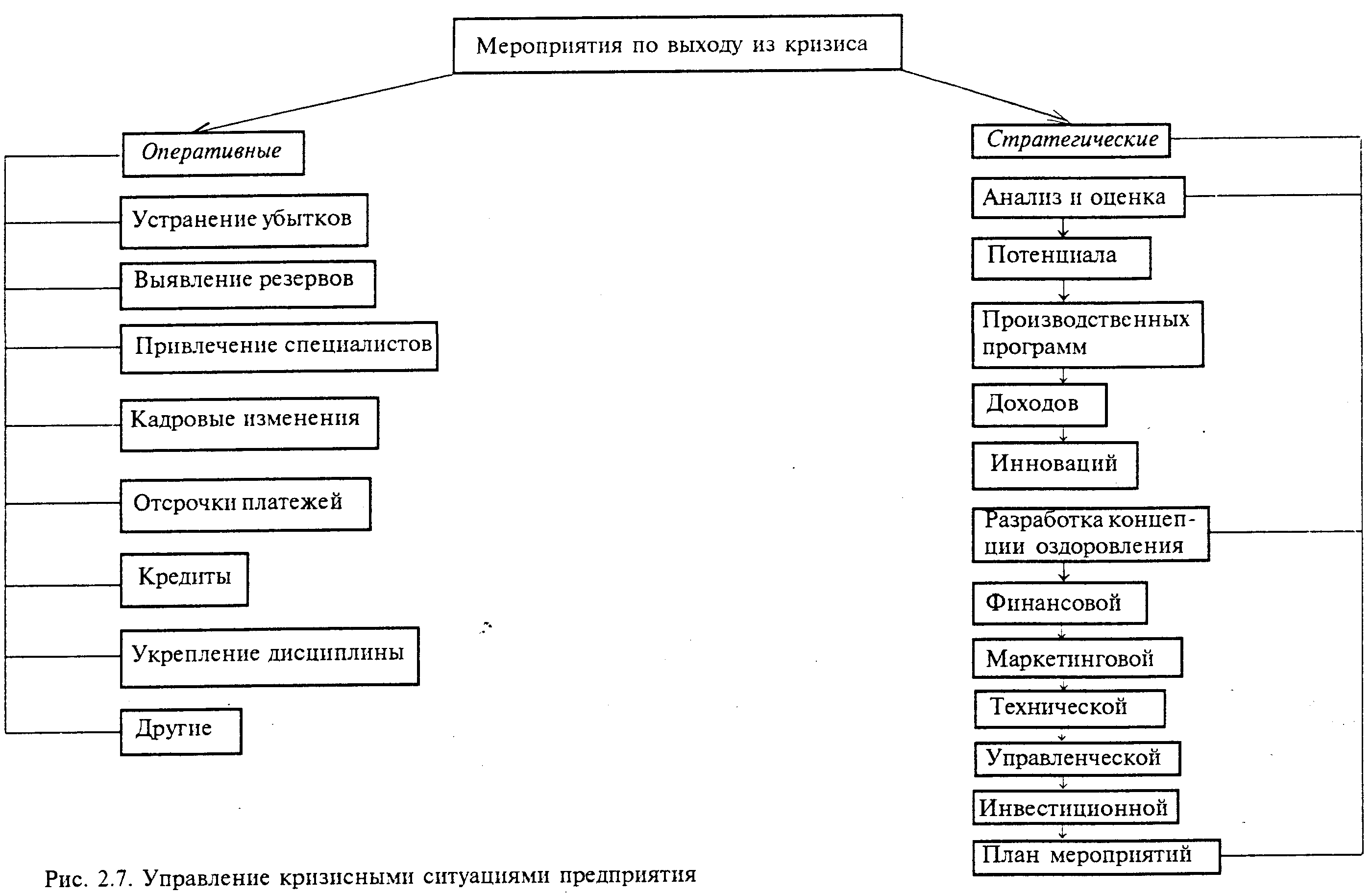 Решению именно этой задачи подчинена система мер, именуемая антикризисным управлением. Часто под таким управлением понимают либо управление в условиях кризиса, либо управление, направленное на вывод предприятия из кризисного состояния, в котором оно находится.