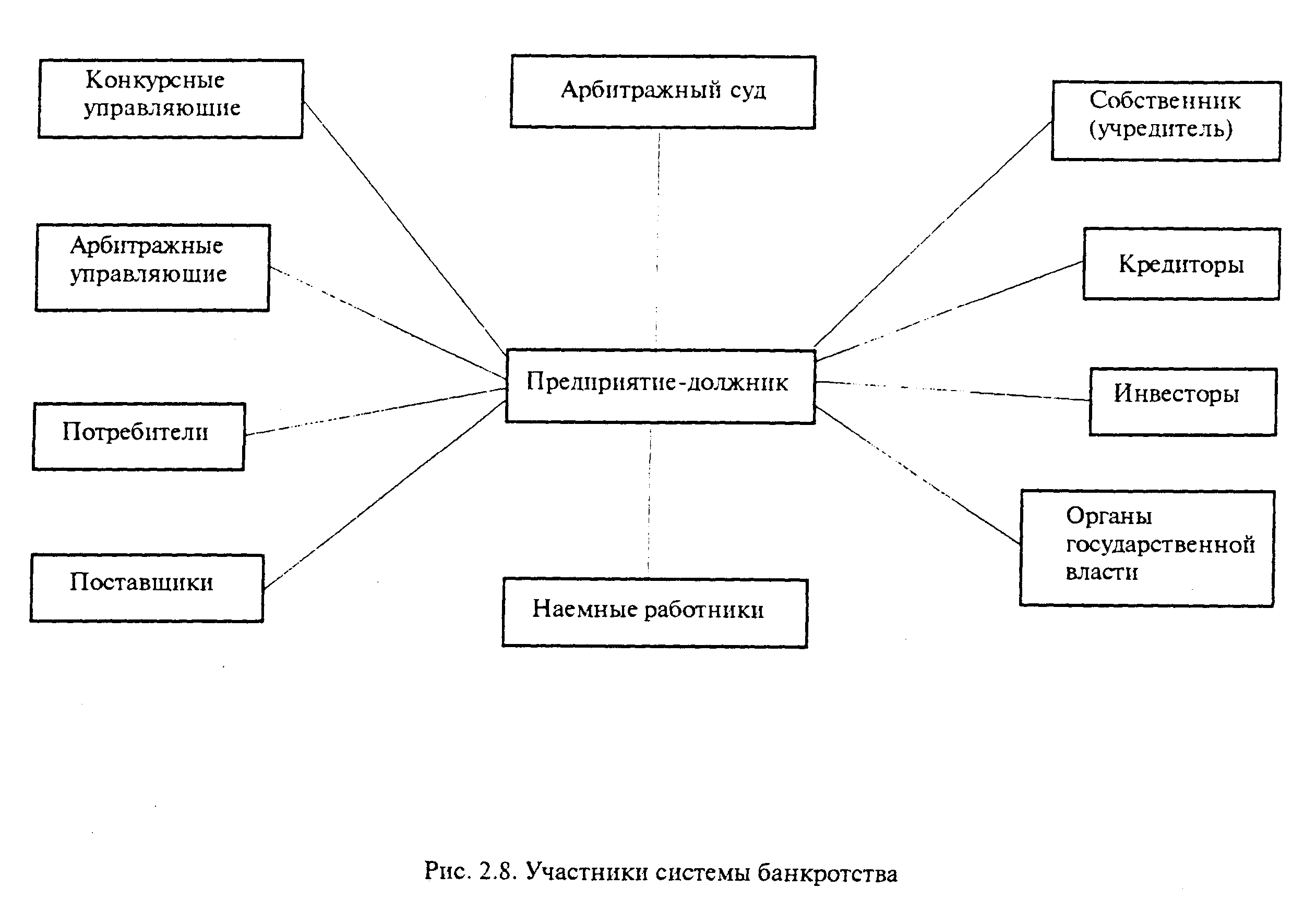 Целью создания и приведения в действие механизмов системы банкротства в РФ является необходимость проведения структурной перестройки всего народного хозяйства в соответствии с рыночным спросом населения при условии достижения прибыльной работы основных производящих товары и услуги структур. Основные участники системы банкротства представлены на рис. 1.4.