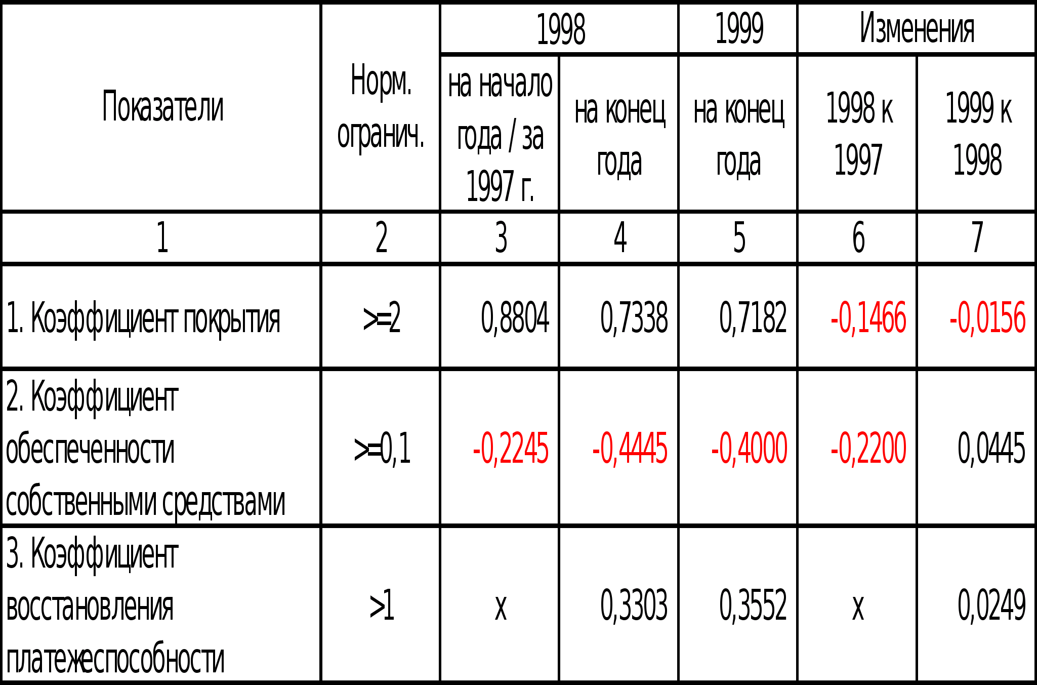 | 1. Коэффициент покрытия | >=2 | 0,8804 | 0,7338 | 0,7182 | -0,1466 | -0,0156 |