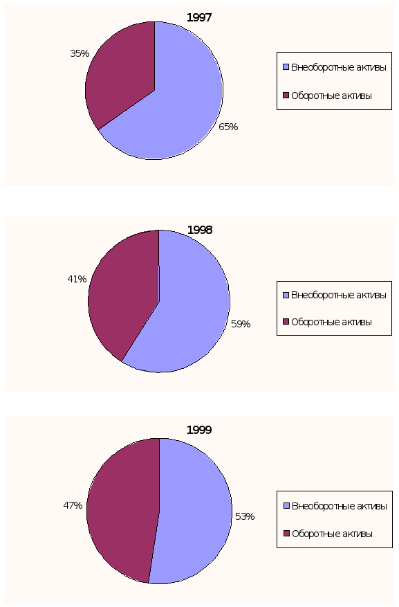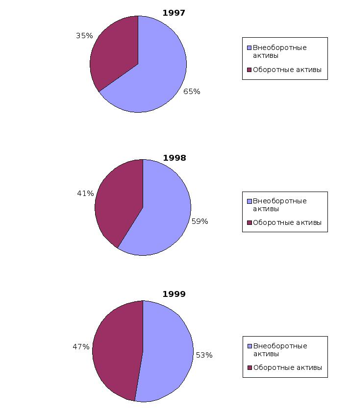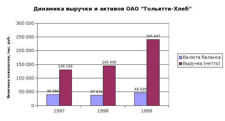 Анализируя показатели работы ОАО «Тольятти-Хлеб» за 1997-1999 гг. следует отметить, что несмотря на общую кризисную ситуацию, предприятие наращивает объем товарной продукции в стоимостном выражении, о чем свидетельствует положительная динамика выручки при незначительном росте активов. Смотрите, пожалуйста, рис. 2.1 и табл. 2.1. В значительной мере это обусловлено постоянным платежеспособным неэластичным спросом на хлебобулочную продукцию, а также инфляционным ростом цен.