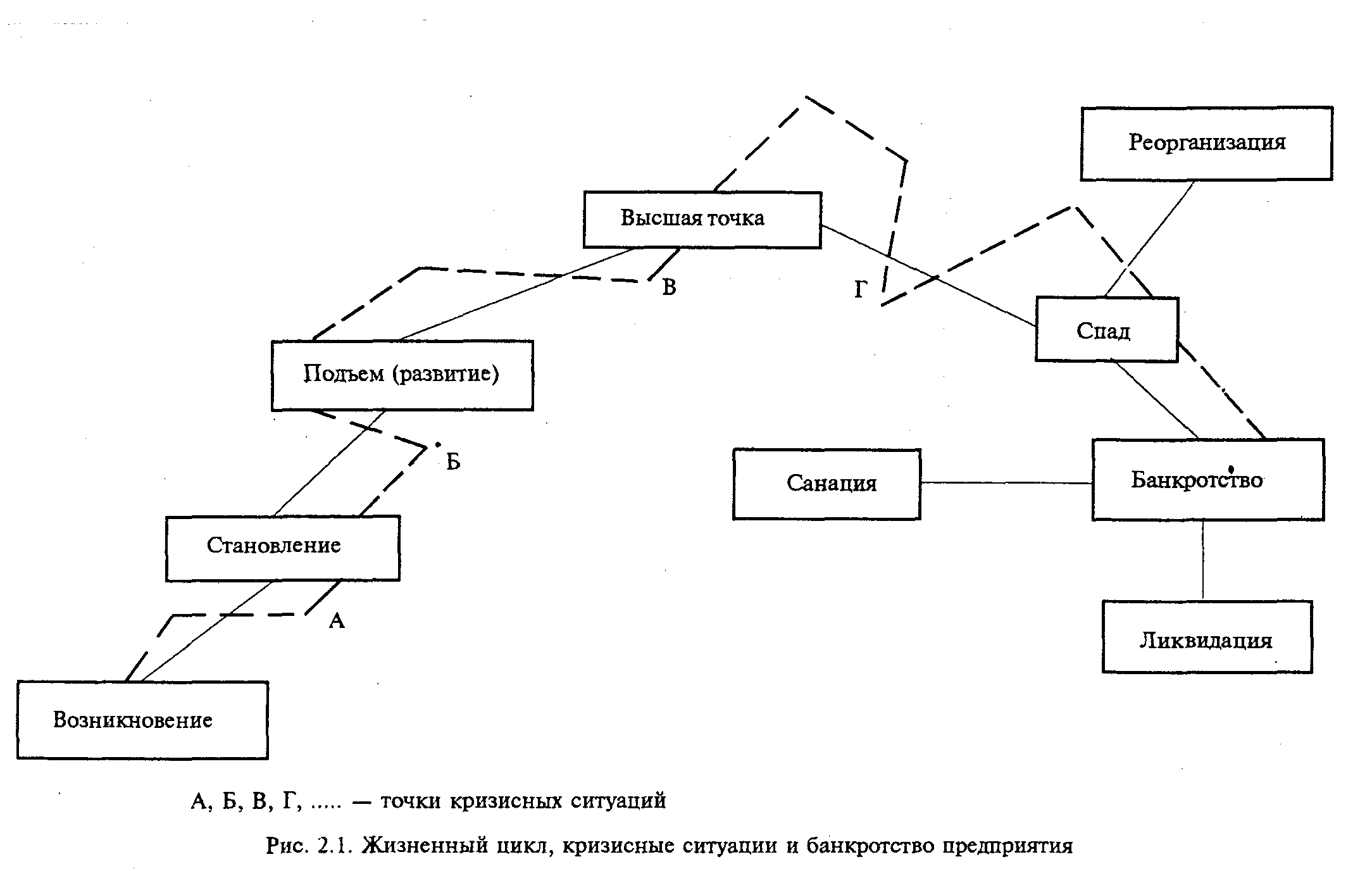 Рис. 1.1. Жизненный цикл, кризисные ситуации и банкротство предприятия