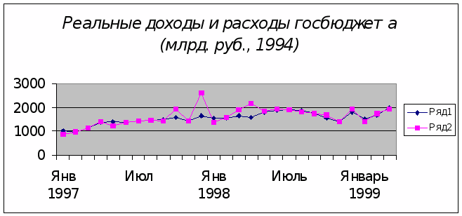 Примечание: ( ряд 1 – реальные доходы, ряд 2 – реальные расходы).