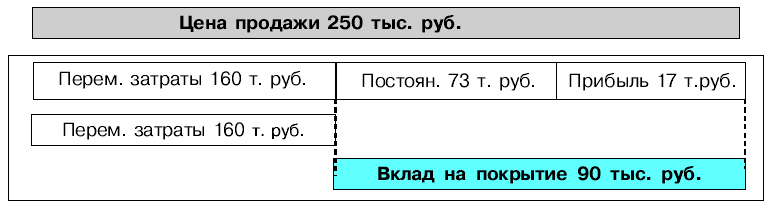 Так же существует другой метод определения дохода, который использует понятие вклада на покрытие. При данном подходе, доход рассматривают состоящим из переменных затрат и вклада на покрытие. Например, если доход равен 250 тыс. руб., то он состоит из переменных затрат 160 тыс. руб. и вклада на покрытие 90 тыс. руб.5