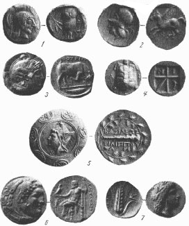 1.Афинская монета V в. до н.э. с изображением Афины и совы. 2.Коринфская монета V – IV c изображение Афины и Пегаса. 3.Греческая монета с изображением Афины и быка. 4.Греческая монета с изображением черепахи IV в. 5. Монета македонского царя Филиппа V (конец III в. – начало Ii в) с изображением Персея палицы Геракла. 6.Монета Александра Македонского (конец IV в.) с изображением Геракла в львиной шкуре. 7.Монета Фессалии с изображением Афины.