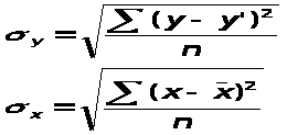 Где σ>х> - квадратическое отклонение x от выравненных значений х(cp), а σ>y> - среднее квадратическое отклонение признака y от выравненных значений y΄, или стандартизированная ошибка аппроксимации;