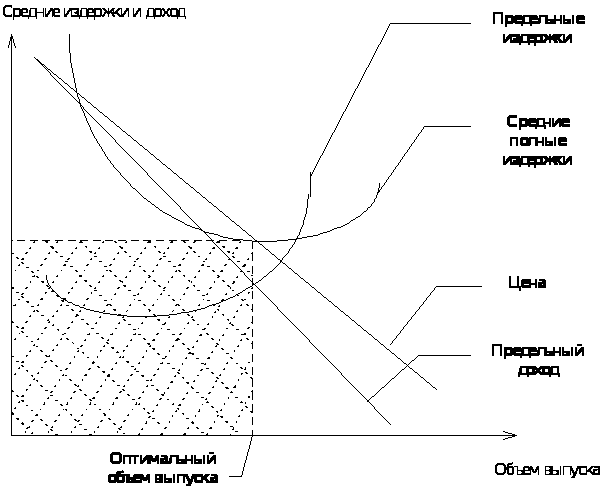 В данном случае равенство предельного дохода и предельных издержек достигается в той точке, в которой цена реализации данного количества продукции выше средних полных издержек. Следовательно, в данном случае предприятие максимизирует свою экономическую прибыль.