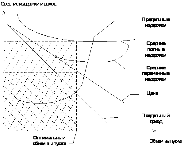 Начиная с некоторого момента (с некоторого объема выпуска) кривая переменных издержек будет являться возрастающей, а кривая предельного дохода - убывающей. Для целей максимизации прибыли основным является соотношение между предельным доходом и предельными издержками при увеличении выпуска на одну единицу. Очевидно, что в случае, когда предельные издержки меньше предельного дохода, увеличение выпуска повлечет за собой увеличение дохода фирмы; в случае же когда предельные издержки больше предельного дохода, к увеличению предельного дохода фирмы приведет уменьшение выпуска продукции. Теперь возможно сформулировать критерии точки, в которой достигается максимальная прибыль: