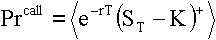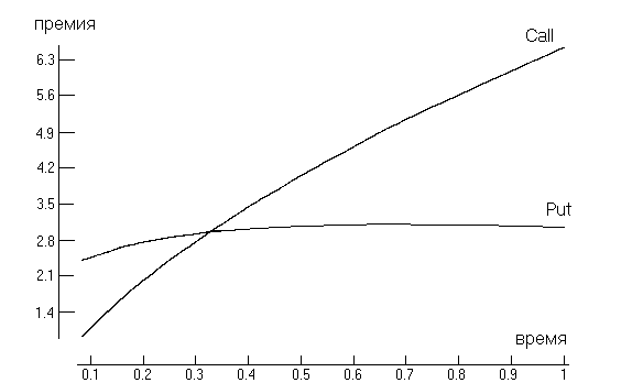 Рис.2. Зависимость премии опционов купли и продажи европейского стиля от цены исполнения