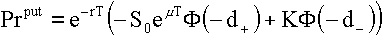 Рис.6. Зависимость премии опционов продажи американского и европейского стиля от цены акции