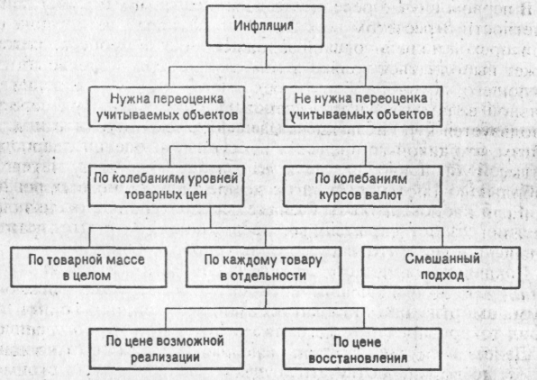 С окончания первой мировой войны многие ученые и практики бьются над проблемой: как сделать реальным учет в условиях инфляции? Накопилось множество предложений, во многих странах уже сложилась определенная в этом отношении практика. Следует отметить, что интерес к проблеме учета инфляции периодически то возрастает, то затухает. Стоило в середине 70-х годов темпу инфляции в экономически развитых странах несколько возрасти, как немедленно национальные учетные ассоциации обратили внимание на эту проблему. Не случайно именно в это время был разработан первый международный стандарт по учету влияния инфляции (стандарт № 15), введенный в действие в ноябре 1981 г. Известные в мировой практике подходы к учету и анализу влияния инфляции могут быть систематизированы в виде следующей схемы (рис. 11.1).