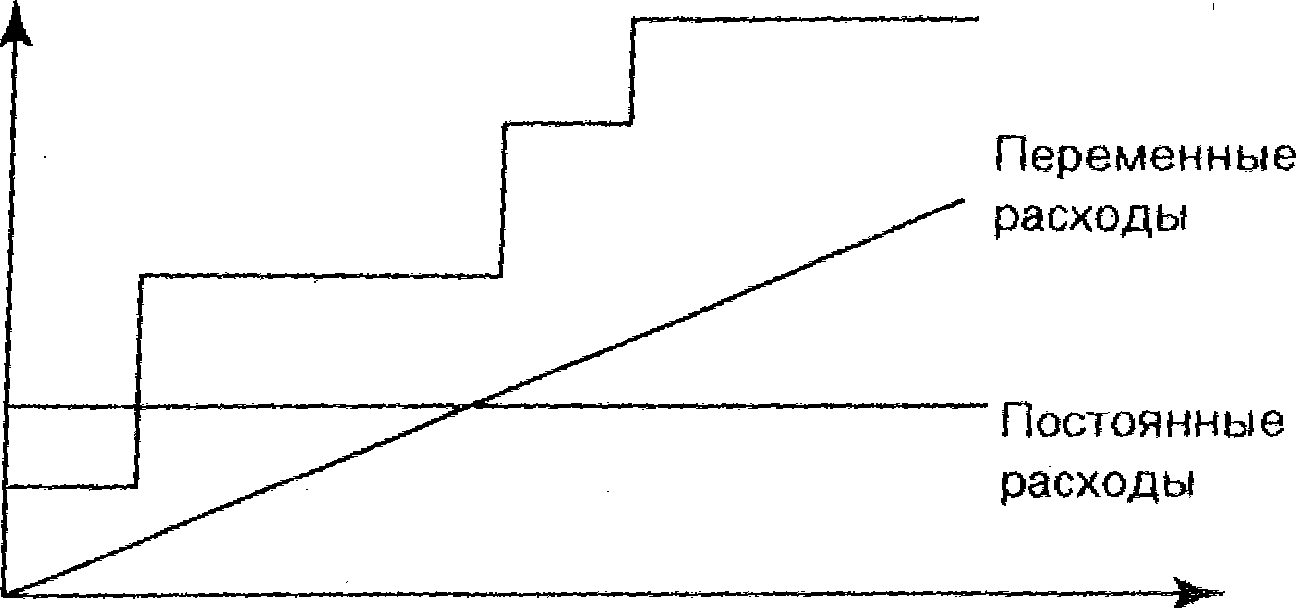 Приведенная классификация расходов также является условной, тем не менее она более реально отражает динамику различных их видов. К постоянным расходам относятся расходы, практически не зависящие от объемов производственной деятельности и являющиеся чаще всего контрактными (например, арендная плата). Для наглядности они представлены на схеме в виде прямой, параллельной оси абсцисс. Полупеременные расходы представляют собой расходы, меняющиеся скачкообразно, т.е. стабильные при варьировании объема выпуска в некотором интервале и меняющиеся при выходе объема производства за пределы данного интервала. В качестве примера можно привести расходы по реализации продукции (например, транспортные расходы). К переменным расходам относятся расходы, изменяющиеся практически прямо пропорционально изменению объема выпуска (например, расходы сырья и материалов). Для удобства и упрощения излагаемых в дальнейшем материалов постоянные и полупеременные расходы нередко объединяются и называются условно-постоянными.
