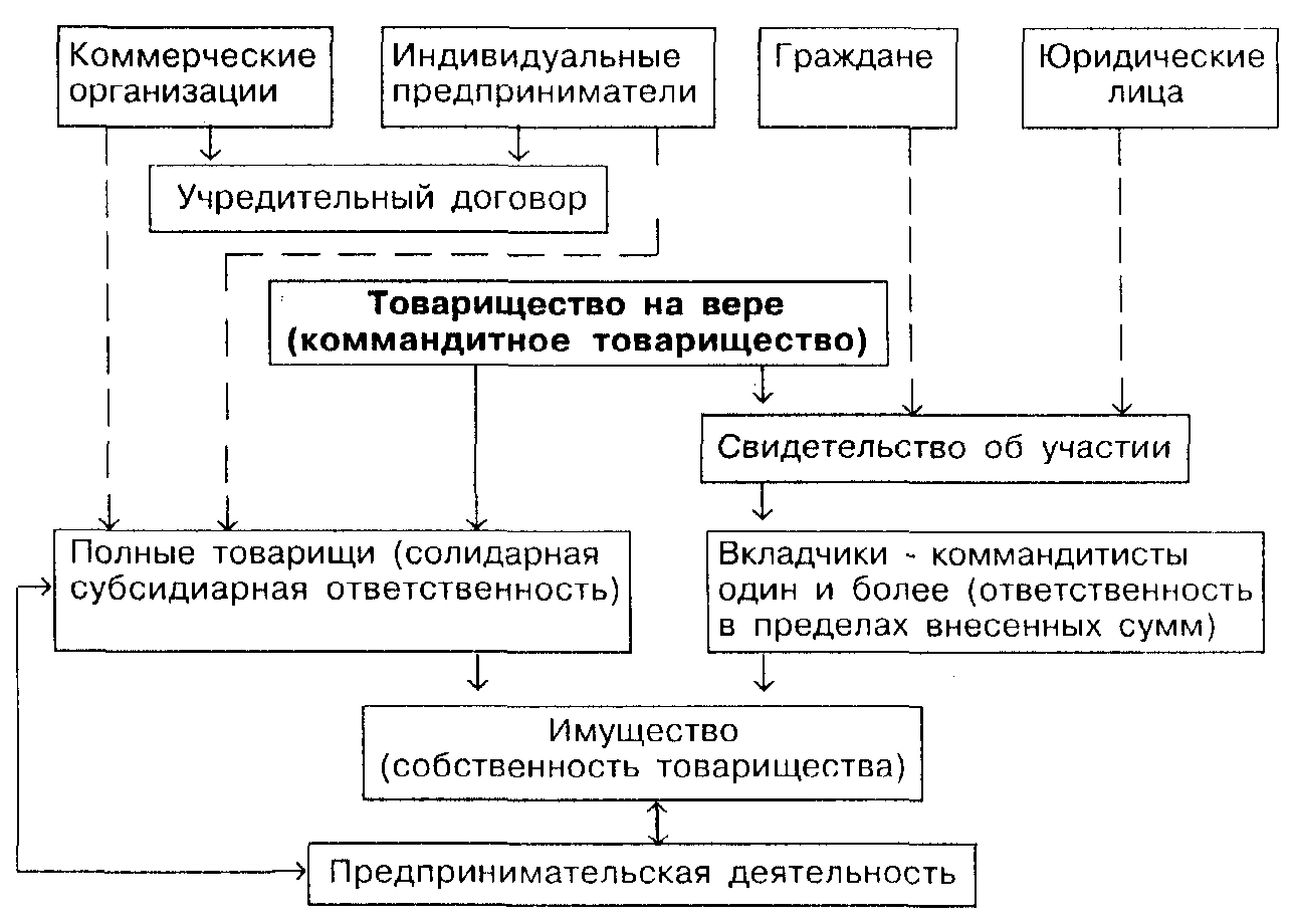 Следующая организационно-правовая форма хозяйствования -товарищество на вере или коммандитное товарищество создается также на основании договора между индивидуальными предпринимателями и/или коммерческими организациями. В него могут входить один или несколько участников, занимающихся от имени товарищества предпринимательской деятельностью и несущих ответственность по обязательствам всем своим имуществом, являющихся полными товарищами, а также участники, которые несут ответственность в пределах сумм, внесенных ими вкладов, являющиеся коммандитистами или вкладчиками. Вкладчиками могут быть любые юридические или физические лица .