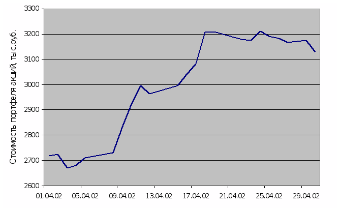 Произведены расчеты по формированию и оптимизации портфеля ценных бумаг для АБ «Дорожник» на апрель 2002г. по предложенной схеме. Применение данной схемы позволило бы получить прибыль в 412468 руб.. Доходность переоценки расчетного портфеля за апрель составила 8,17%.