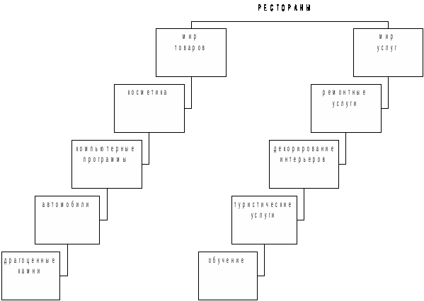 В данной схеме в качестве границы между миром товаров и миром услуг выступает общественное питание. Это связано с тем, что предприятия данной отрасли предназначены для производства (сходны в этой функции с пищевой промышленностью), реализации (сходны с торговлей) и организации потребления кулинарной продукции.