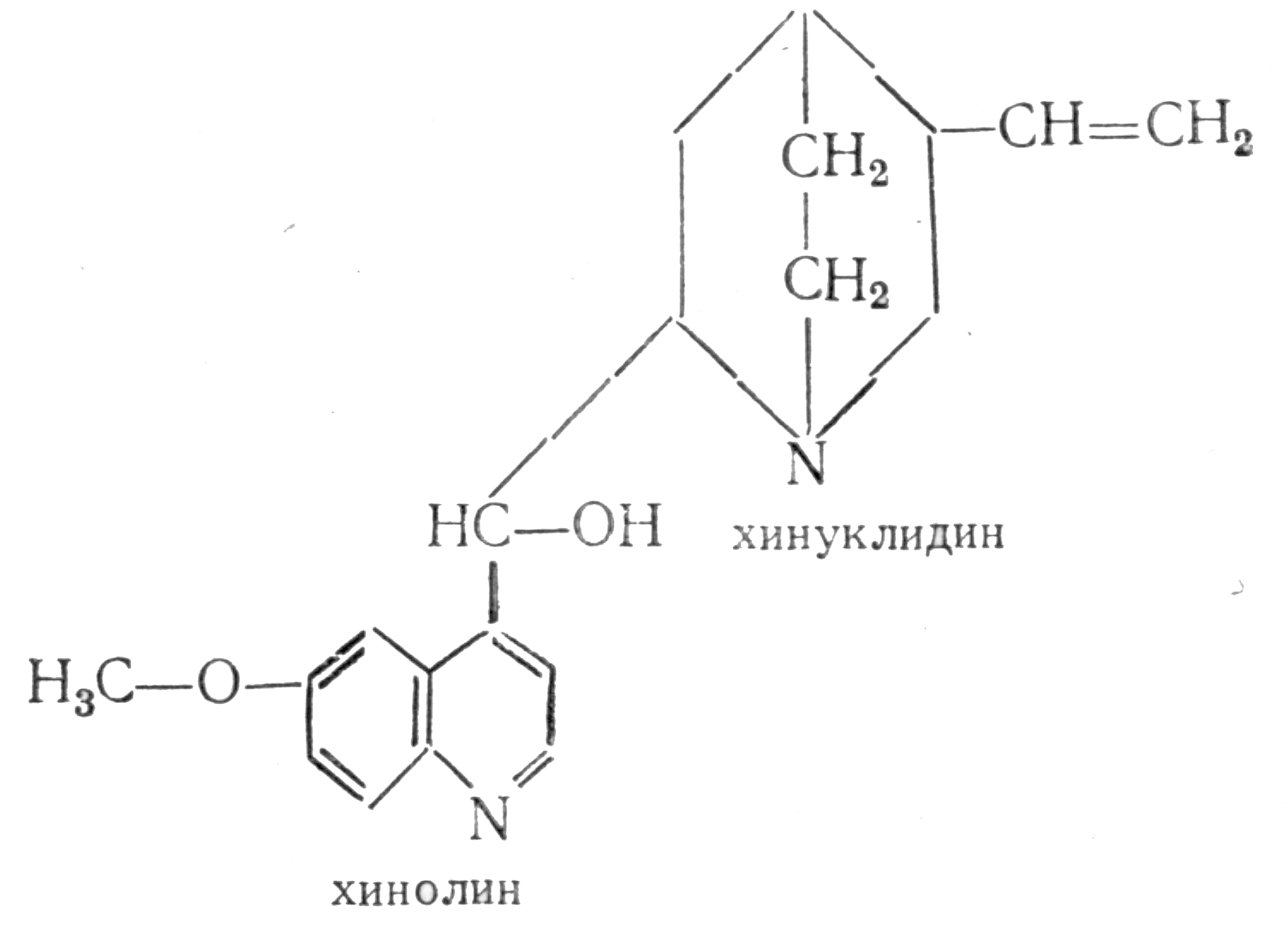 Хинин представляет белые кристаллы, в безводном состоянии плавящиеся при 175°, а из воды выделяющиеся с 3 молекулами кристаллизационной воды. Соли его очень горьки на вкус и обладают в растворе прекрасной синей флуоресценцией. Хинин- важнейшее средство против малярии и вообще жаропонижающее; применяется обыкновенно в виде средней сернокислой или хлористоводородной (с одной молекулой НСL) соли.