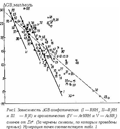 * К сожалению, на рис. 1 не нанесён ряд точек из-за отсутствия или неточности, на наш взгляд, величин * для заместителей в некоторых аминах.