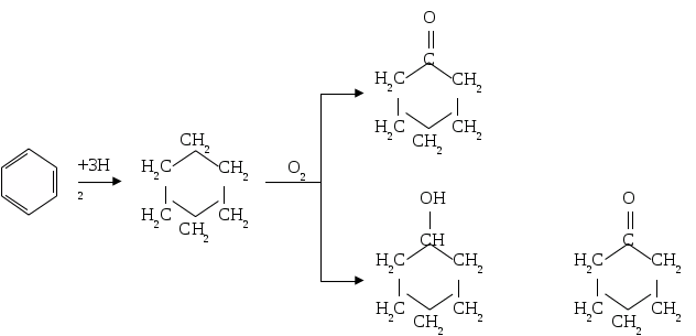 Окисление циклогексана проводят кислородом воздуха в жидкой фазе при 130-140oС и 15-20 кгс / см2 в присутствии катализатора – стеарата марганца. При этом образуются циклогексанон и циклогексанол в соотношении 1:1. Циклогексанол дегенерирует до циклогексанона, а последний превращается в капротам описанным выше способом.