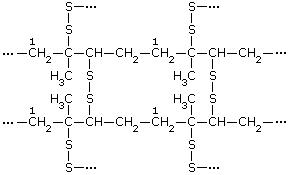 Из смеси каучука с серой, наполнителями (особенно важным наполнителем служит сажа) и другими веществами формуют нужные изделия и подвергают их нагреванию. При этих условиях атомы серы присоединяются к двойным связям макромолекул каучука и «сшивают» их, образуя дисульфидные «мостики». В результате образуется гигантская молекула, имеющая три измерения в пространстве — как бы длину, ширину и толщину. Полимер приобретает пространственную структуру: