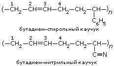 В молекулах этих каучуков звенья бутадиена чередуются со звеньями соответственно стирола и акрилонитрила.