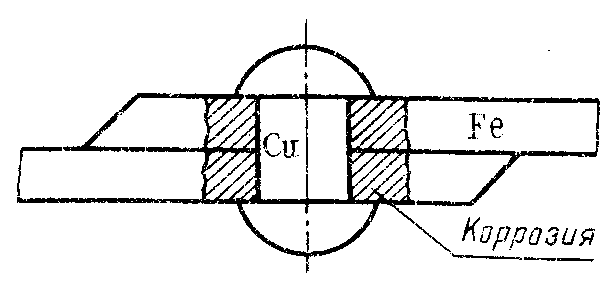 На механизм низкотемпературной коррозии влияет много различных причин: переменная температура и влажность воздуха, переменный состав газовой и электролитной среды и даже бактериальная флора, например при почвенной коррозии, так как некоторые виды бактерий способствуют окислению железа. Развитие коррозии в результате контакта разных металлов можно иллюстрировать схемой, представленной на рис. 1. Наибольшее коррозионное разрушение наблюдается рядом с контактом, так как здесь сопротивление наименьшее и, следовательно, наибольшая плотность тока.